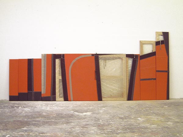 Het uitgangspunt is eenvoudig en vertrekt vanuit de tent en het kamperen. De functionaliteit is de tentvormen ontnomen en is tot een puur plastische taal gebracht. Schilderkunstig betekent hier echter niet langer dat de verfkwast gehanteerd wordt. Zoals de kubisten de potentiële zeggingskracht van materialen vreemd aan de schilderkunst zagen, wordt hier op gelijkaardige wijze een eigen grammatica opgebouwd. De flirt met het reeele object en de oorspronkelijke functie van de tent blijft in het vroege werk nog gesuggereerd, maar wordt dan verder uitgepuurd tot essentiële elementen van het medium schilderkunst: lijn, kleur, vlak, transparantie, gelaagdheid, textuur, compositorische leegte, relatie tot de drager, het tonen van de interne structuur. |