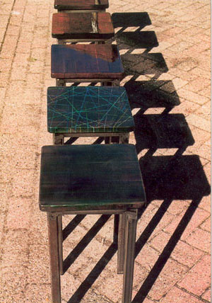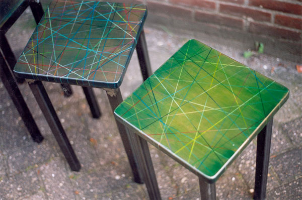 met stalen poten. Men kan letterlijk op een schilderij zitten. |