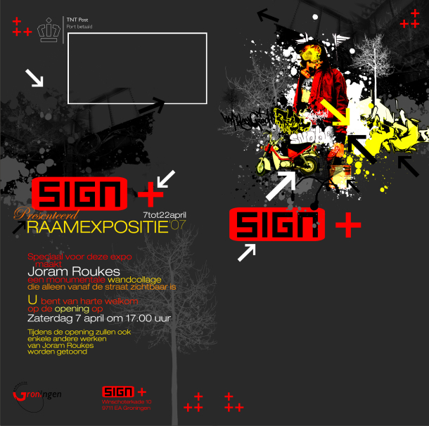 per jaar organiseert Sign een Raamexpositie. Sign heeft hem dan ook uitgenodigd een monumentale wandcollage te maken voor de buitenkant van haar gevel. Dit werk zal alleen vanaf de straatkant continu, non stop te zien zijn. Sign functioneert hierbij als een billboard. Uitsluitend tijdens de opening (7 april 17.00 uur) toont Joram Roukes nog enkele werken binnen in Sign. De rest van de periode zal de binnenzijde van Sign gesloten zijn. Joram