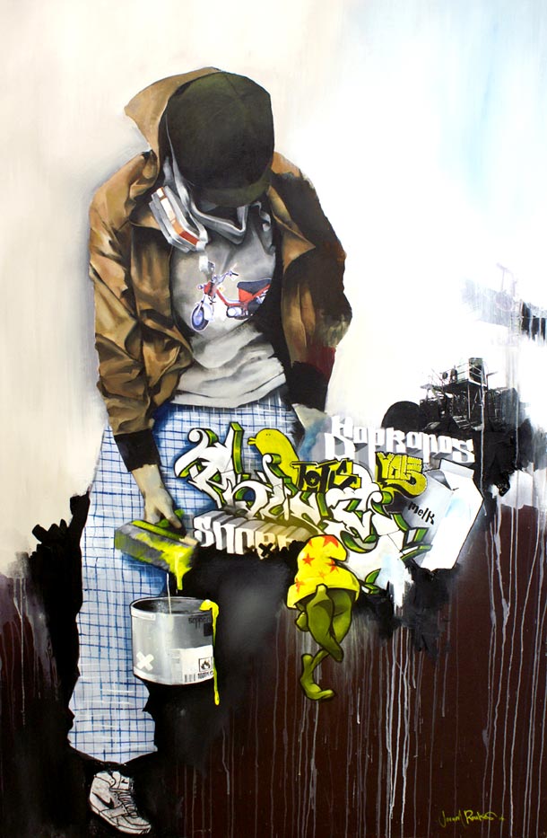 The work of Joram Roukes adds to this. Therefore Sign has invited him to make a monumental wall collage for the outside front of the gallery. This work can be seen continuously from the street. Sign functions in this as a billboard. Only during the opening ( 7 April, 17.00 hrs.) Joram Roukes will show some other pieces inside the gallery. The rest of the exhibition the gallery-space itself will be closed. Joram Roukes was born on February 25th in 1983 in Lelystad in the Netherlands. He graduated from the academy of fine arts Minerva in Groningen in 2006. After he graduated he got nominated for several artistic awards and had more than a few exhibits and shows in the Netherlands and abroad. He now lives and works in New York City. His work clearly shows his fascination for and interest in modern city