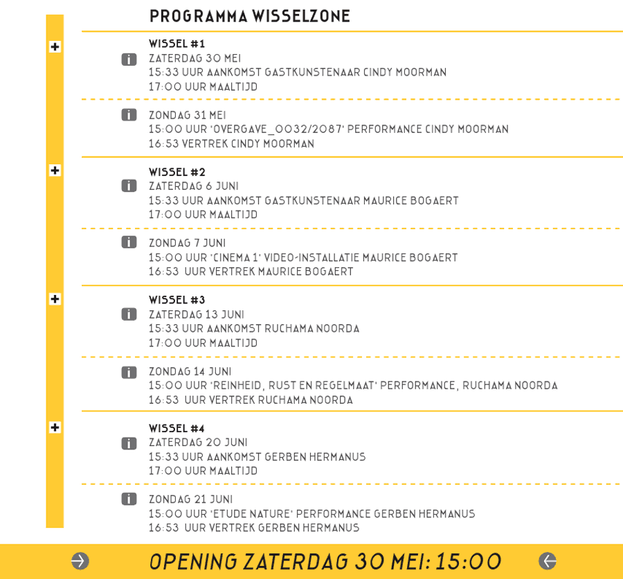 wisselzone wordt geopend op zaterdag 30 mei om 15.00 uur met de ontvangst van de eerste gastkunstenaar Cindy Moorman . Zij brengt op