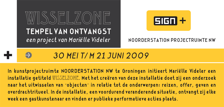Marielle Videler zal de ruimte daarvoor transformeren door middel van wandschilderingen, tekeningen, markeringen, speciaal meubilair, textiel etc. Performatieve acties, waarbij dansbewegingen, kleding en voorwerpen een rol spelen, vormen de rituelen van ontvangst en vertrek van de gastkunstenaars. Publiek wordt daarbij onderdeel van de “gemeenschap”.
