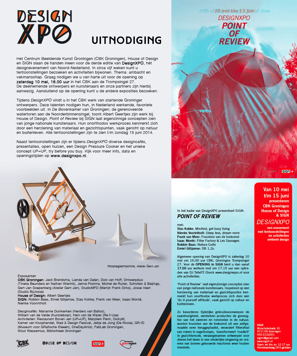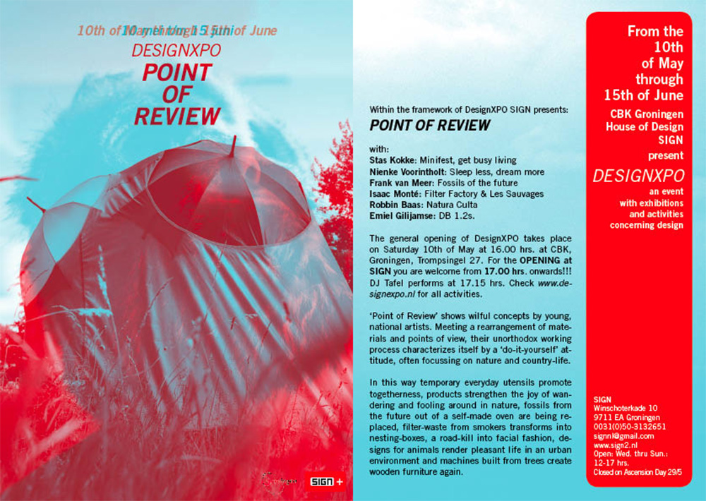 In dat kader presenteert SIGN: POINT OF REVIEW Algemene opening van DesignXPO is zaterdag 10 mei om 16.00 uur CBK, Groningen Trompsingel 27 ‘Point of Review’ laat eigenzinnige concepten zien van jonge nationale kunstenaars. Inspelend op een herziening van materiaal en gezichtspunten kenmerkt hun onorthodox werkproces zich door een 'do it yourself attitude', vaak gericht op natuur en buitenleven. Zo bevorderen tijdelijke gebruiksvoorwerpen de saamhorigheid, versterken producten de geneugten van het zwerven en rommelen in de natuur, worden fossielen van de toekomst uit een zelfgemaakte oven teruggeplaatst, verandert filterafval van rokers in vogelhuisjes, transformeert 'roadkill' in gezichtsmode, veraangenamen ontwerpen voor dieren het leven in een stedelijke omgeving en creëren van bomen gebouwde machines weer houten meubels. SIGN |
