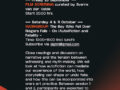 – Zaterdag 4 & 11 oktober, 10:00–15:00 (incl. lunch). Voertaal: Engels. Opgave: signnl@gmail.com. WERKGROEP: De jongen die over de Niagarawaterval viel – Over (auto)fictie en fataliteit – Close readings en discussie over narratief en de spanning tussen getuigen en mythevorming. We bekijken hoe autofictie onze ervaring van de wereld kan bemiddelen, hoe storytelling het lot kan vormen of ongedaan kan maken, en hoe dit kan worden geïntegreerd in iemands kunstpraktijk. Tussen sessie 1 en 2 wordt van de deelnemers verwacht dat ze een kort verhaal schrijven dat met de groep wordt gedeeld.