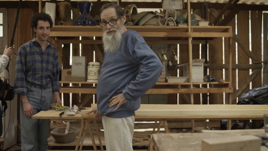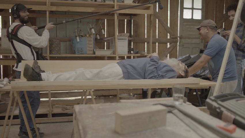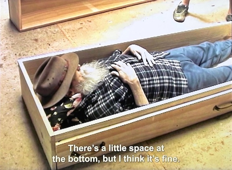 Bernardo Zanotta: ‘Above My Father’ (2025) is a fragment, a raw, unprocessed excerpt from a longer feature film I am developing. One that began with the invitation, or perhaps the impossible proposition, to film my father’s death. This short piece stands as the most documentary-like segment of this work that otherwise drifts toward the vampiric, the theatrical, the spectral and melodramatic, echoing the atmosphere of Jean Rollin, but also of many others like Almodovar, Raul Ruiz and what not. For now, in this iteration of the show at Sign, what I can make public is just something very unguarded. I am sharing the process and sharing my grief in a way. What you see is my father building his own coffin, and me, his son, filming it. What I am looking for with this is precisely to give voice to what you call the broken cycle; the failure of closure: no reappearance after the vanishing, no curtain call. It’s just an awkward “double exposure” indeed for now.