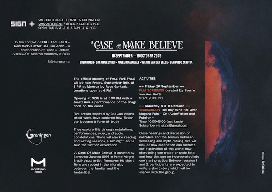 Among these events, at SIGN projectspace , a group of artists have developed new works where the boundaries between fiction and reality, as well as their documentation and reenactment, serve as a starting point. A CASE OF MAKE BELIEVE challenges the very notion of these boundaries, proposing that constructed narratives and lived experience are inherently intertwined and perhaps even indistinguishable.