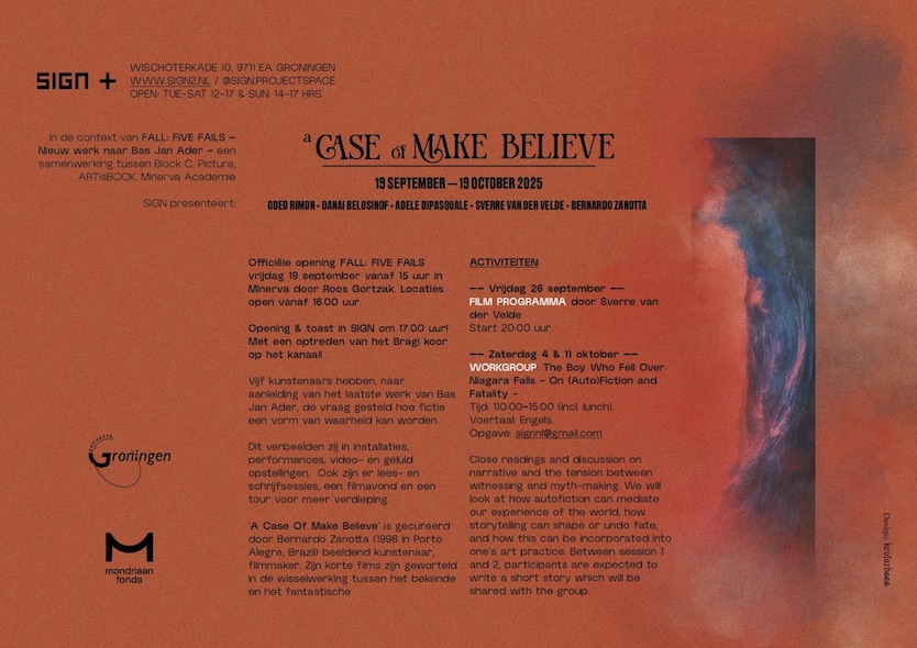 ’A Case Of Make Believe’ is gecureerd door Bernardo Zanotta (1996 in Porto Alegre, Brazil) beeldend kunstenaar, filmmaker. Zijn korte films zijn geworteld in de wisselwerking tussen het bekende en het fantastische.
