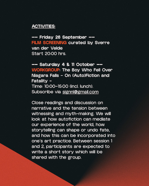 – Zaterdag 4 & 11 oktober, 10:00–15:00 (incl. lunch). Voertaal: Engels. Opgave: signnl@gmail.com. WERKGROEP: De jongen die over de Niagarawaterval viel – Over (auto)fictie en fataliteit – Close readings en discussie over narratief en de spanning tussen getuigen en mythevorming. We bekijken hoe autofictie onze ervaring van de wereld kan bemiddelen, hoe storytelling het lot kan vormen of ongedaan kan maken, en hoe dit kan worden geïntegreerd in iemands kunstpraktijk. Tussen sessie 1 en 2 wordt van de deelnemers verwacht dat ze een kort verhaal schrijven dat met de groep wordt gedeeld.