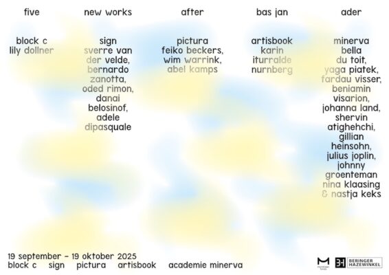Feiko Beckers, Abel Kamps and Wim Warrink in Pictura, Lily Dollner in Kunstruimte Block C, Sverre van der Velde and Bernardo Zanotta in SIGN and under the latter curatorship also: Oded Rimon, Danai Belosinof, Adele Dipasquale. Karin Iturralde Nurnberg is exhibiting for ARTisBOOK and finally in Minerva in the Koepelzaal at the Praediniussingel location, eleven third-year students are exhibiting: Bella du Toit, Yaga Piątek, Fardau Visser, Beniamin Visarion, Johanna Land, Shervin Atighehchi, Gillian Heinsohn, Julius Joplin, Johnny Groenteman, Nina Klaasing and Nastja Ke.
